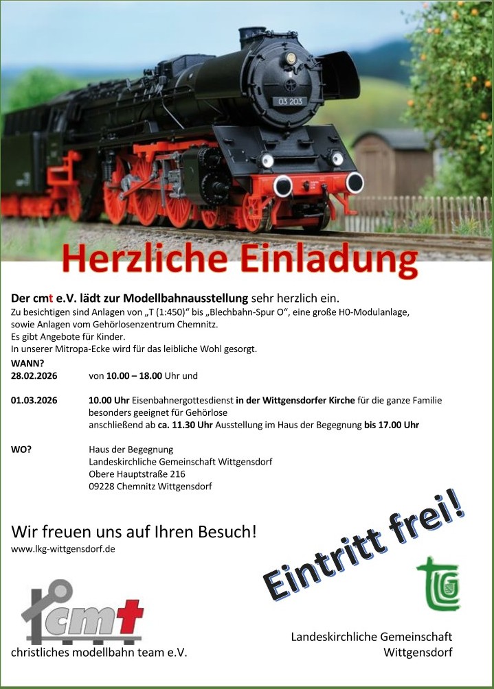 Am 28.02./ 01.03.2026 findet in unserem Haus der Begegnung eine Modellbahnausstellung statt. Diese wird vom cmt e.V. durchgeführt. Was verbirgt sich hinter „cmt“? Die Buchstaben stehen für: Christliches Modellbahn Team e.V. Wir sind Freunde der kleinen und großen Bahn. Wir wollen unseren Glauben und unser Hobby in Verbindung aktiv leben. In unserem Leben gibt es auch „Weichenstellungen“. Auch wir sollten „Signale und Hinweisschilder“ beachten. Auch wir müssen wieder auftanken und unsere „Energievorräte“ ergänzen. Wir freuen uns an Gottes Schöpfung. Wir freuen uns aber auch über das, was jeder von uns im Kleinen geschaffen hat. Wir wollen nicht nur unsere Werke präsentieren, sondern gern mit Ihnen ins Gespräch kommen.